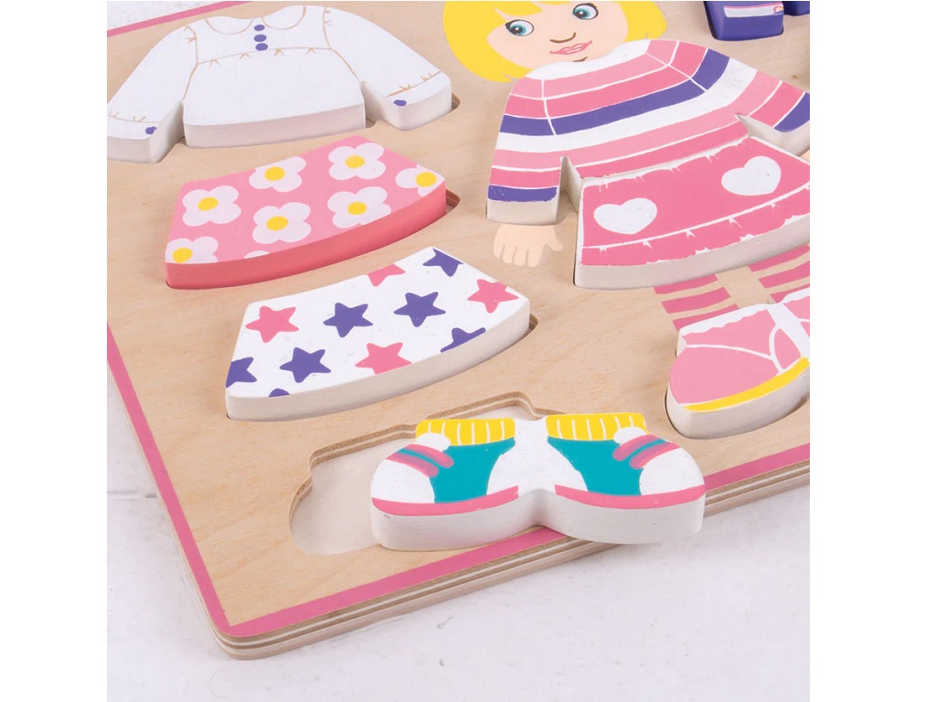 BigJigs Vstavljanka – Oblačimo deklico je primerna za otroke od 1. leta naprej.