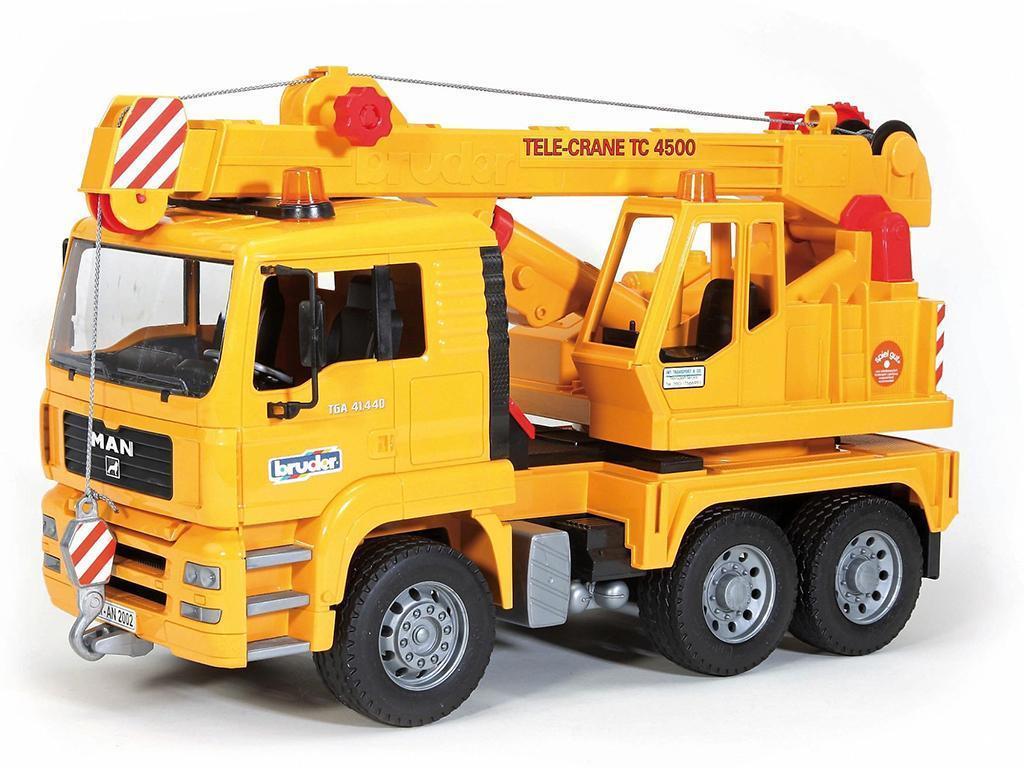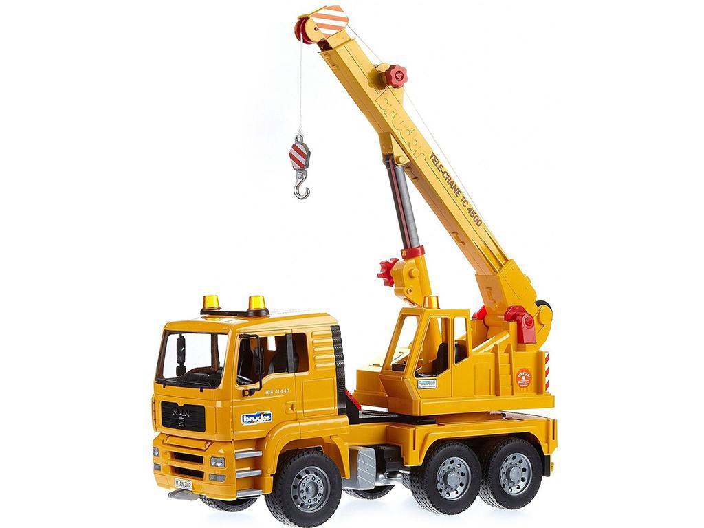 Bruder Tovornjak MAN z dvigalom 02754 – Nagibna kabina tovornjaka z žerjavom MAN omogoča pogled na blok motorja. Ogledala v vozniški kabini se lahko zložijo. Priključek žerjava je mogoče zasukati za 360°, ročico žerjava s kavljem pa je mogoče podaljšati z vrtljivim kolesom in prilagoditi višino s hidravliko. Kabelski vitel je v celoti funkcionalen s pomočjo ročice. Gumb za sprostitev pospeši spuščanje tovora. Štiri opore zagotavljajo varno oporo. Sliko dopolnjujejo pnevmatike s tekalno plastjo in priložena škatla za orodje. Za še večjo zabavo pri igranju lahko tovornjak z žerjavom MAN opremite s svetlobnim in zvočnim modulom št. izdelka: 02801 (ni priložen).