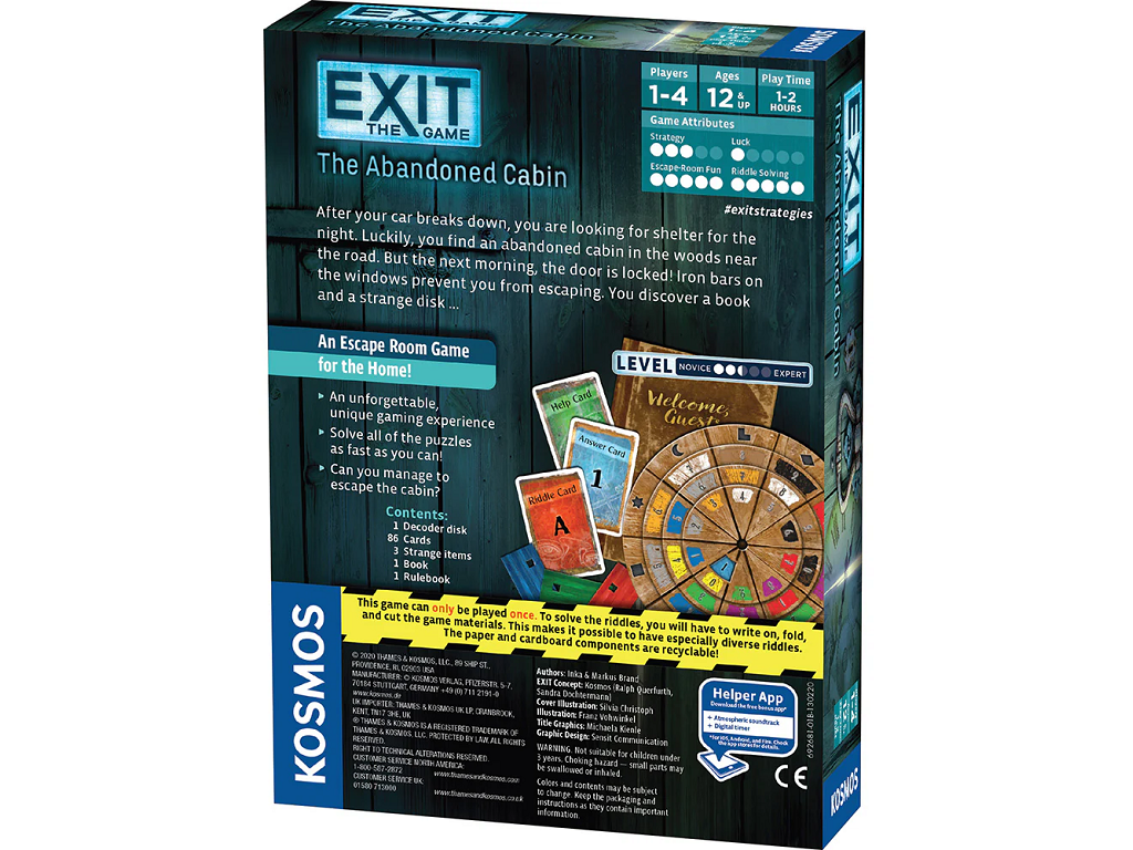 Družabna igra Exit – The Abandoned Cabin – Ali lahko pobegnete iz zapuščene koče? Po okvari avtomobila ste primorani prenočiti v zapuščeni koči sredi gozda. Zjutraj ugotovite, da so vrata zaklenjena, in kmalu postane jasno, da se iz koče ne boste rešili brez reševanja zapletenih ugank. Lastnik koče je pustil skrivnostne sledi – jih lahko razvozlate in pravočasno pobegnete?