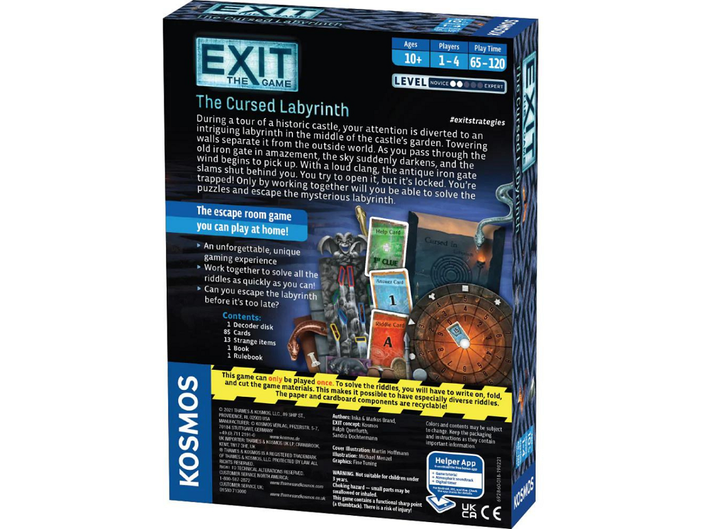 Zasnovana kot soba pobega v obliki igre, Exit – The Cursed Labyrinth prinaša napeto, skrivnostno in unikatno izkušnjo, polno izzivov, skritih sledi in presenetljivih preobratov. Igra je zasnovana za enkratno igranje, saj morate pri reševanju ugank označiti, zložiti ali razrezati igralne materiale.
