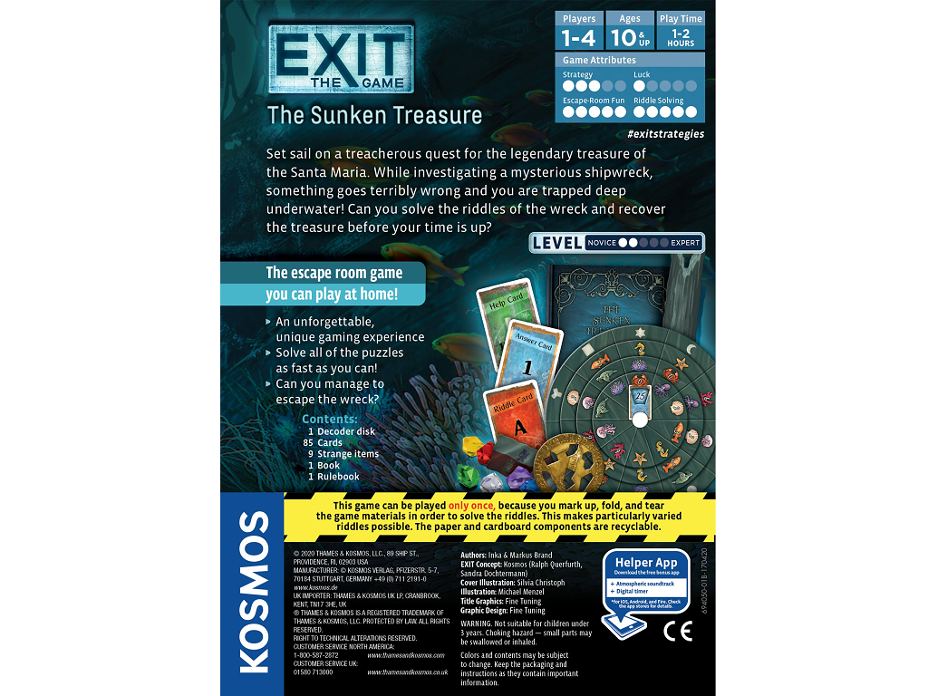 Exit – The Sunken Treasure je pustolovska igra v slogu sobe pobega, kjer boste s pomočjo namigov, logičnega razmišljanja in iznajdljivosti reševali izzive potopljene ladje. Igra je namenjena enkratni uporabi, saj boste pri igranju morali označevati, prepogibati ali trgati igralne materiale.