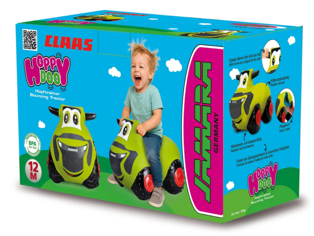 HopHop Claas traktor je napihljiva poskočna igrača, ki spodbuja gibanje in ravnotežje. Primeren za zabavno igro doma ali na prostem.
