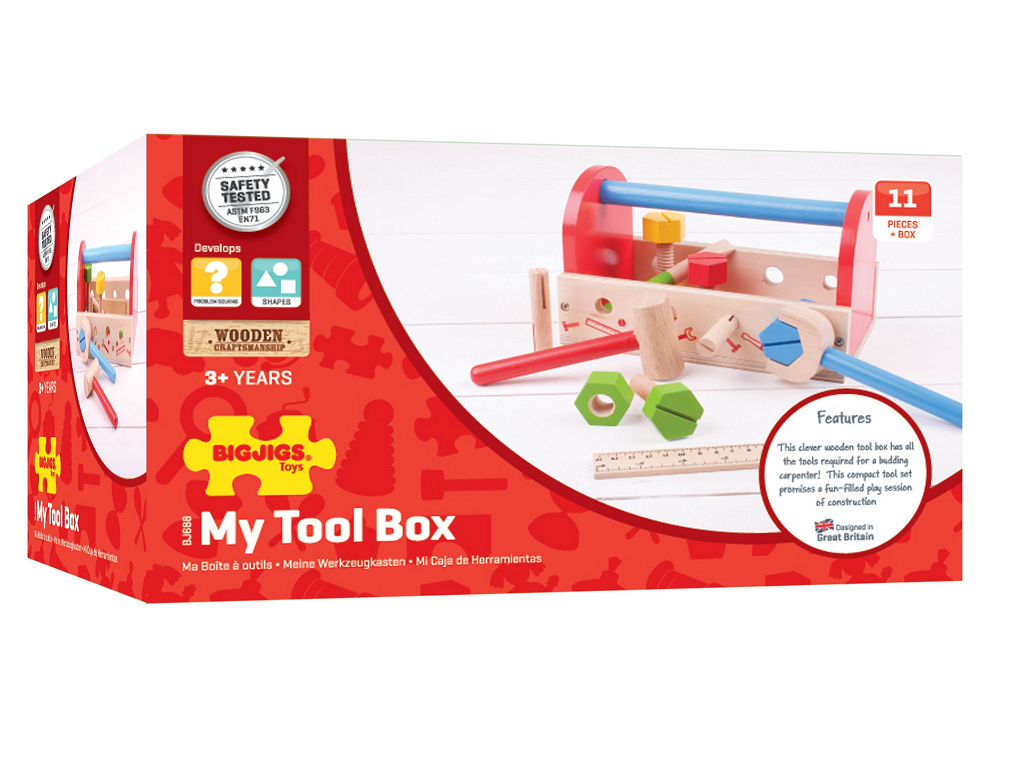 Ta lesena škatla za orodje vključuje vse, kar mora mladi obrtnik opraviti s popravljanjem! Vključuje ključ, kladivo, matice in vijake, izvijač in ravnilo. Trdna škatla ima vgrajen ročaj, tako da lahko otroci na pot vzamejo orodje! Pomaga razviti spretnost in koordinacijo. Odličen način za spodbujanje ustvarjalnih in domiselnih sej iger vlog. Vsi leseni kosi so iz masivnega lesa, lahki in popolnoma veliki za majhne roke. Izdelano iz visokokakovostnih, odgovornih materialov. V skladu z veljavnimi evropskimi varnostnimi standardi. Starost 3+ leta. Širina: 22,9 cm. Sestavljeno iz 16 igralnih del.