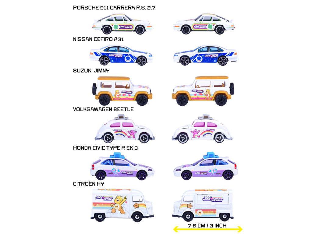 Majorette Care Bears Premium Cars 6-sort. združuje priljubljene like iz sveta Care Bears z zabavnimi kovinskimi mini avtomobili. Vsak model je skrbno oblikovan, barvit in okrašen z motivi prikupnih medvedkov, ki prinašajo veselje in pozitivno energijo.