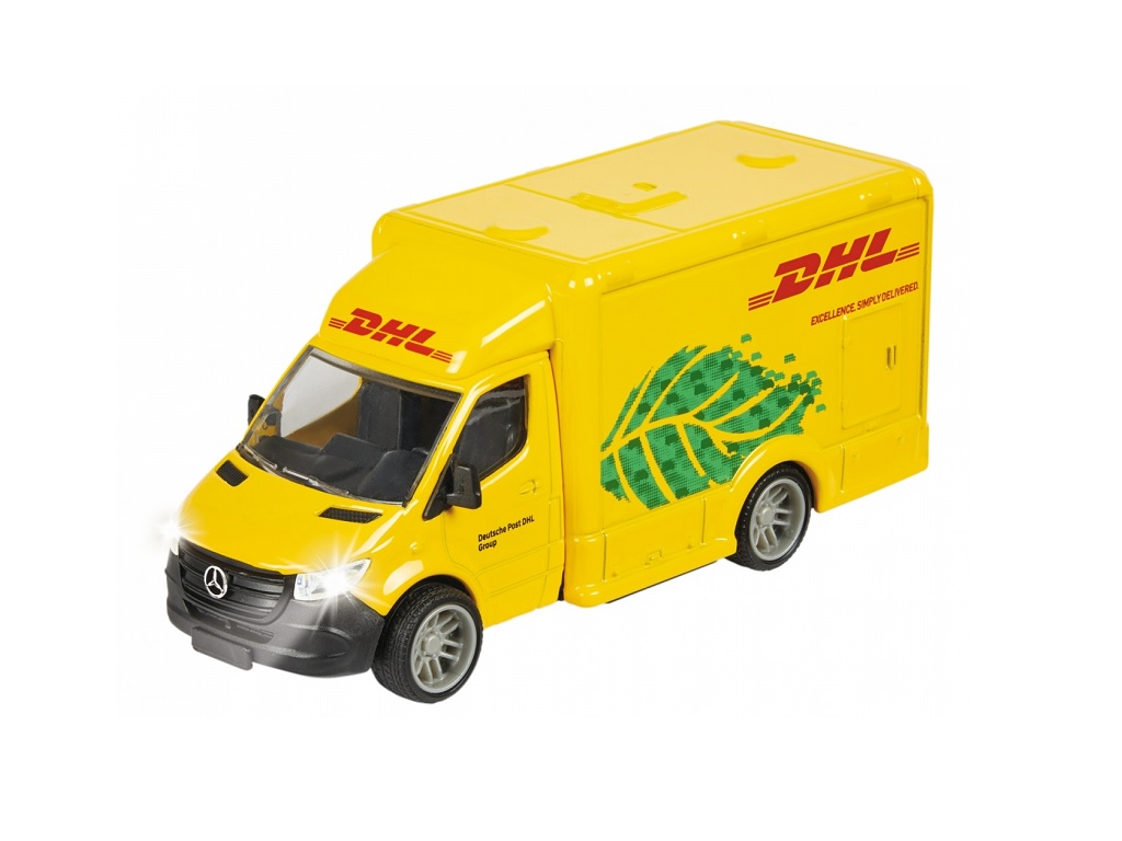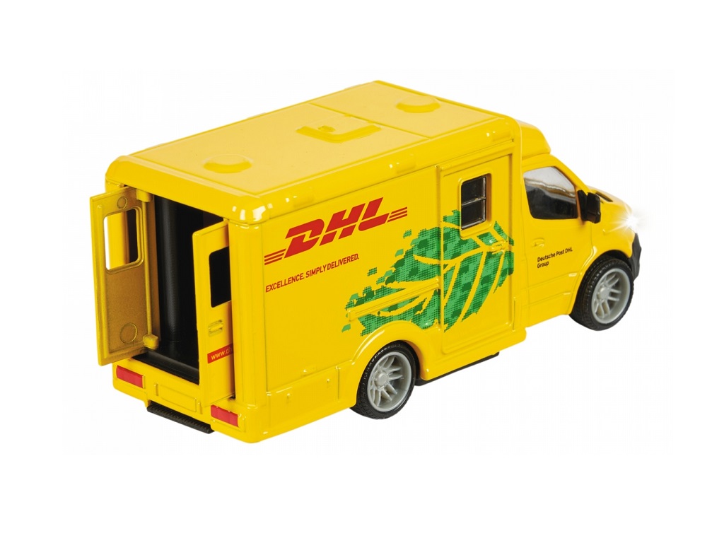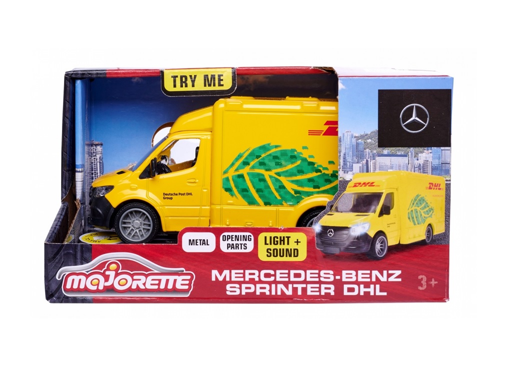 Majorette Mercedes Benz Sprinter DHL igrača z dizajnom DHL, transportno vozilo v merilu 1:43 s številneimi funkcijami, za zbiratelje in je primerna za otroke od 3. leta starosti.