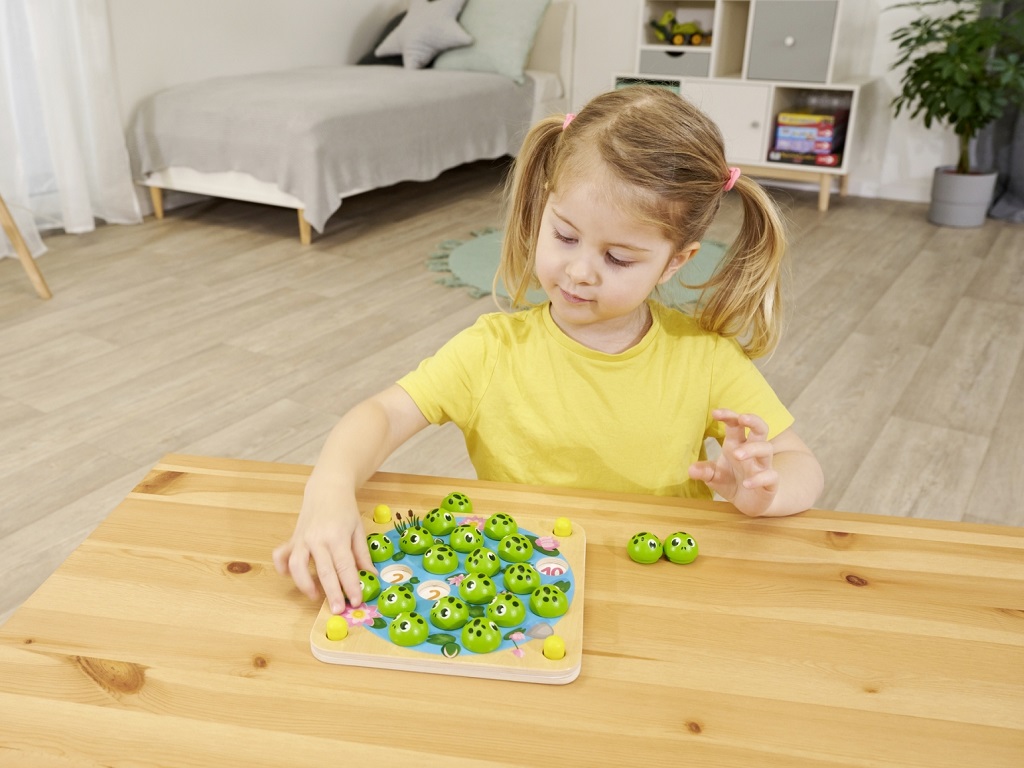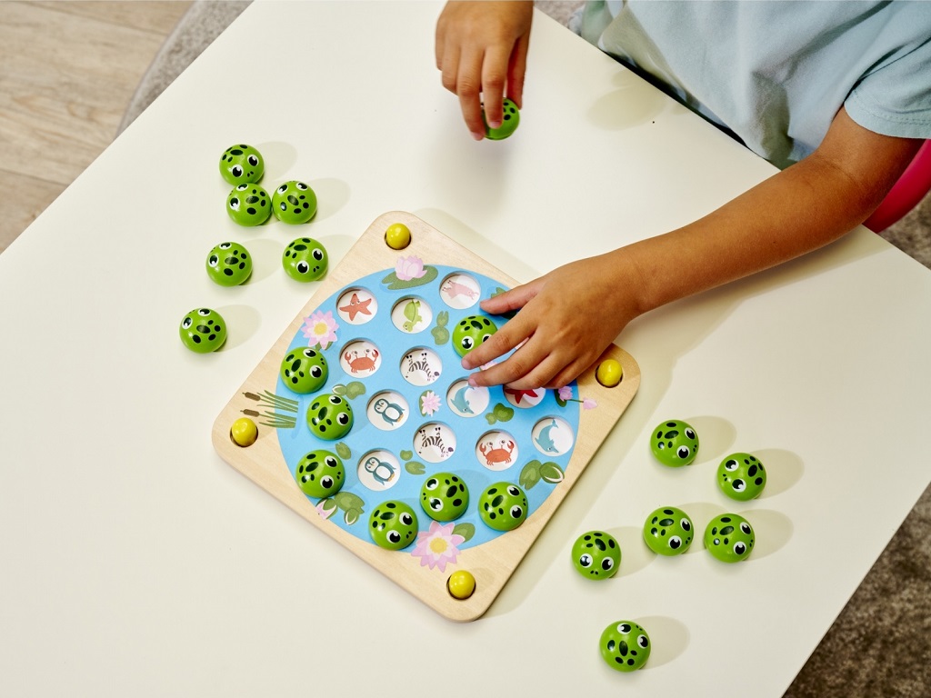 Glavni cilj igre je preprost: najti pare žabic. Otroci morajo skrbno opazovati in si zapomniti položaje žabic ter nato ugotoviti, kateri dve žabici sta enaki. Ta naloga spodbuja otrokov spomin, koncentracijo in opazovanje. Vsaka neuspešna izbira pomeni, da se žabice ponovno potopijo v vodo, kar dodatno motivira otroke, da si zapomnijo postavitev.