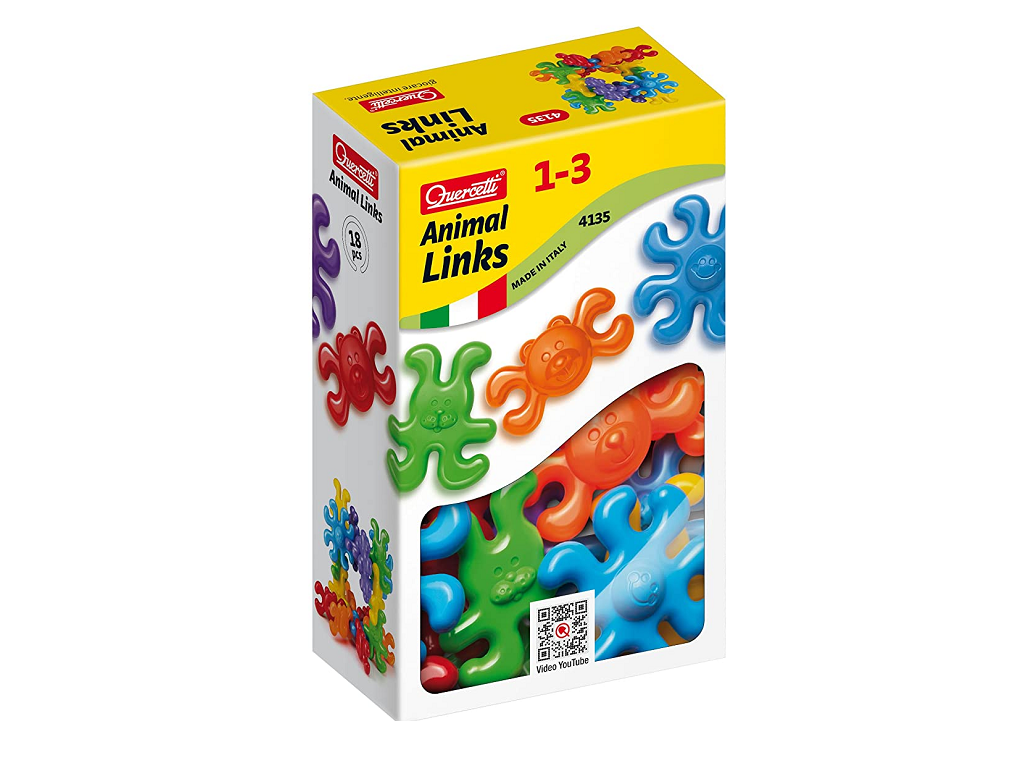 Komplet za najmlajše. Otroci barvne dele povezujejo v verige ali druge strukture, hkrati pa razvijajo fino motoriko, vizualno-gibalno koordinacijo, razlikujejo barve in oblike ter krepijo mišice v rokah.