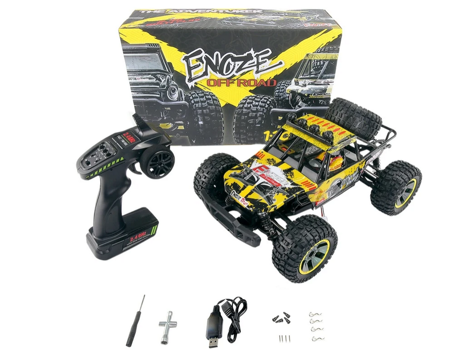 RC Buggy Enoze rumen 4WD 1:10 – Predstavljeni model je izdelan v merilu 1:10, zato je videti neverjetno realistično. Neverjetna hitrost 48 km/h, ki jo doseže, bo poskrbela, da bo zabava vzbudila veliko navdušenja in dala odmerek adrenalina. To je najboljša izbira za vsakega RC navdušenca. Številne funkcije, ki jih ponuja to vozilo, so impresivne. Opremljeno je z visokokakovostnimi in vzdržljivimi sestavnimi deli, zato bo prineslo čudovito dirkaško izkušnjo.