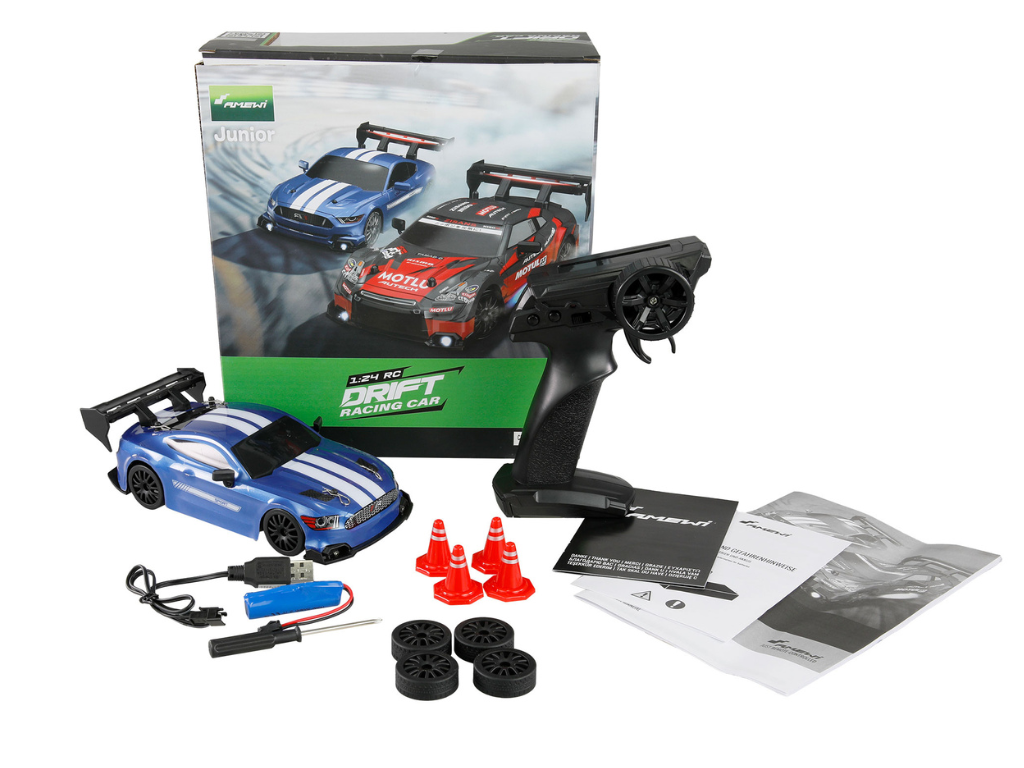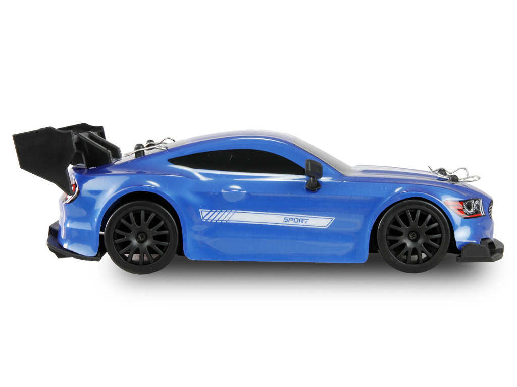 RC Drift Racing Car 4WD 1:24 moder – Odkrijte razburljiv svet dirkalnih avtomobilov s tem RC Drift Racing Car 4WD 1:18 v rdeči barvi. Ta replika dinamičnega športnega avtomobila v merilu 1:24 zagotavlja nepozabno vožnjo z nadzorovanim drsenjem skozi zavoje, zahvaljujoč štirikolesnemu pogonu. Nameščene drift pnevmatike omogočajo spektakularne drift manevre na gladkih površinah, medtem ko LED osvetlitev na sprednjem, zadnjem delu in podvozju poudarja športni videz modela. Popolna izbira za vožnjo v temnih prostorih ali zunaj ob mraku.