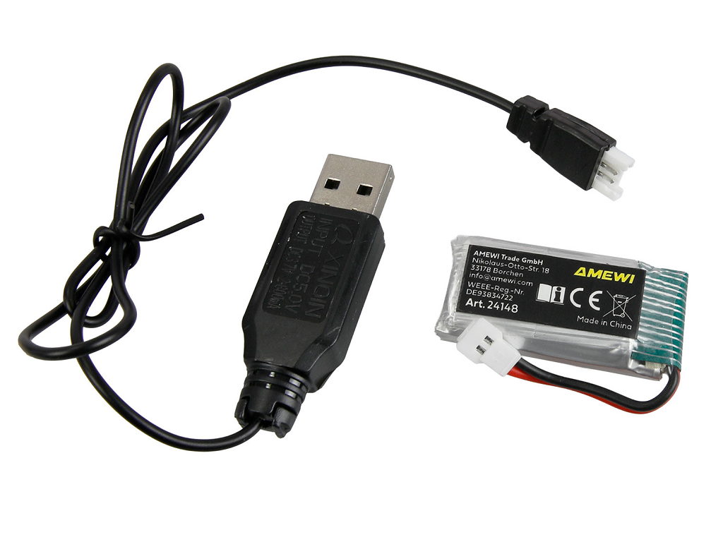 RTF komplet vsebuje vse, kar je potrebno za letenje takoj: model, daljinski upravljalnik, baterija, USB kabel, stojalo, orodja in navodila.