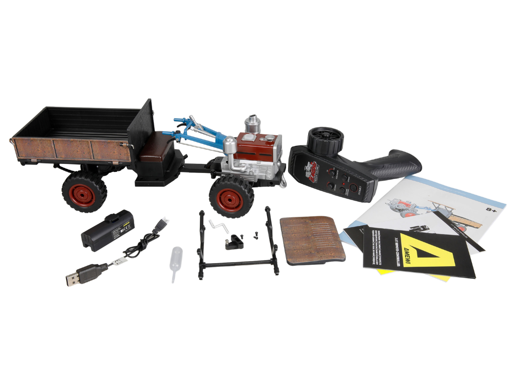Traktor poganja zmogljiv 4WD sistem z dvema motorjema, ki zagotavljata dober oprijem na različnih podlagah. Guma na pnevmatikah omogoča stabilnost in boljši nadzor. Za še bolj realistično izkušnjo poskrbijo LED luči, zvok motorja in funkcija dima na vodni osnovi.