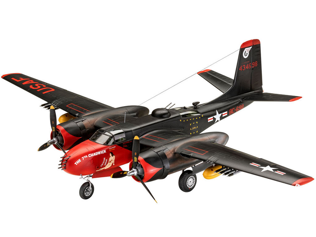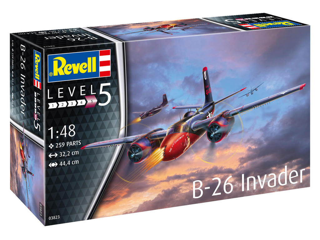 Revell maketa B-26 Invader 03823 – Douglas B-26 Invader je bil srednji bombnik in jurišno letalo, ki so ga ZDA uporabljale med drugo svetovno vojno, korejsko vojno in celo v zgodnjih fazah vojne v Vietnamu. Letalo je slovelo po svoji hitrosti, zmogljivosti prenašanja tovora in prilagodljivosti za različne bojne naloge. Zasnovan je bil za podnevi in ponoči ter se je izkazal kot zanesljiva izbira za strateške napade in podporo enotam na terenu.