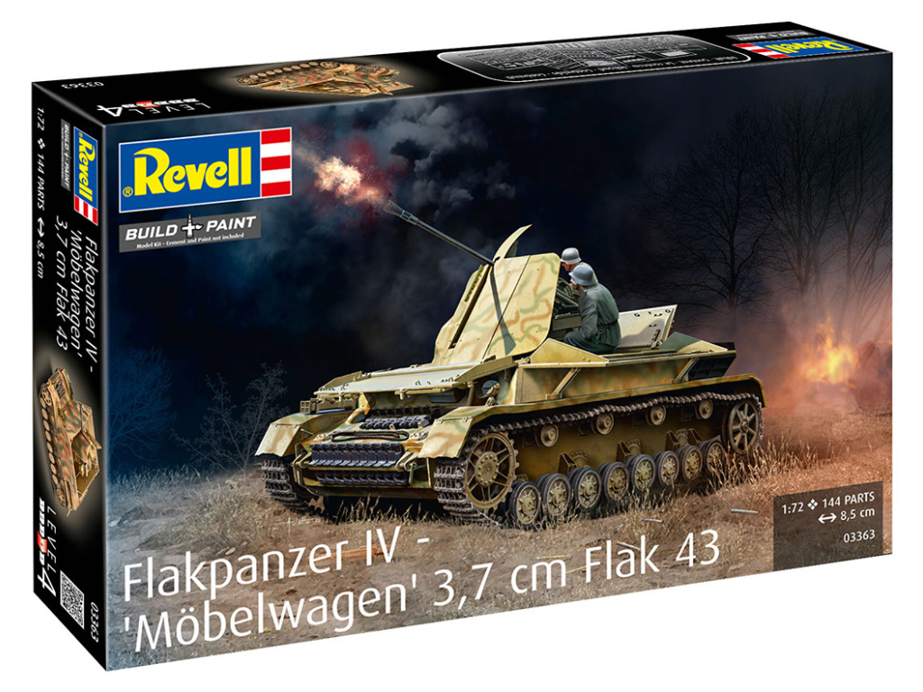 Revell maketa Flakpanzer IV 03363 – Flakpanzer IV “Möbelwagen” je bil razvit leta 1944 kot odgovor na naraščajočo potrebo po mobilni protiletalski obrambi. Svoj vzdevek je dobil po značilnih oklepnih ploščah, ki so se v boju zložile in spominjale na kombi za pohištvo. Vozilo je bilo zasnovano na preizkušenem podvozju Panzer IV in oboroženo z učinkovitim 3,7 cm protiletalskim topom Flak 43. Zaradi te kombinacije je postal pomemben sestavni del nemških protiletalskih sil v poznih fazah vojne.