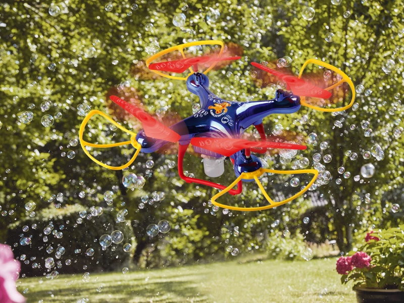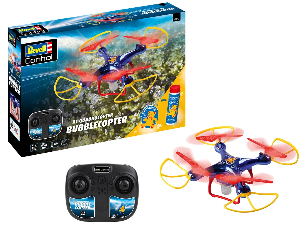 Revell RC dron Quadrocopter Bubblecopter – Milni mehurčki iz zraka! Inovativni Revell Control Bubblecopter ne ustvari le pravega vzdušja na vseh dogodkih in praznovanjih, temveč tudi za zabavo na vrtu ali v parku, saj zrak napolni s svetlečimi milnimi mehurčki Rezervoar kvadrokopterja preprosto napolnite z visokokakovostno tekočino za milne mehurčke po originalnem skrivnem receptu podjetja Pustefix in s pritiskom na gumb na daljinskem upravljalniku ustvarite mavrične mehurčke. Seveda je zasnovan v dizajnu priljubljenega proizvajalca milnih mehurčkov z medvedkom.