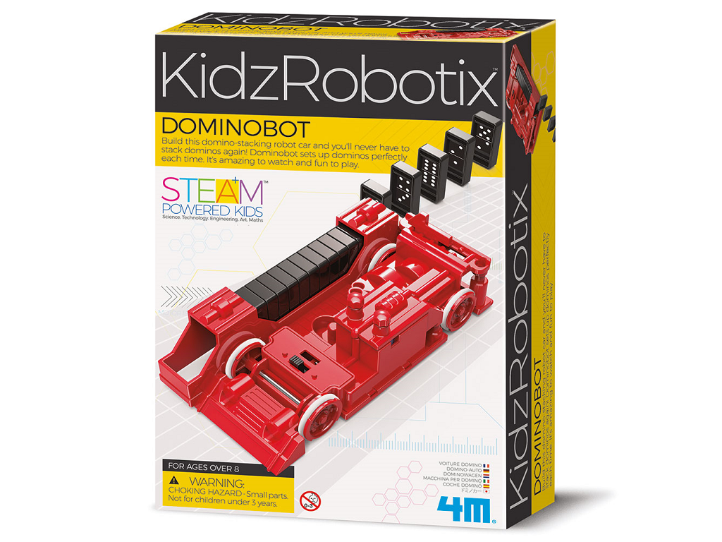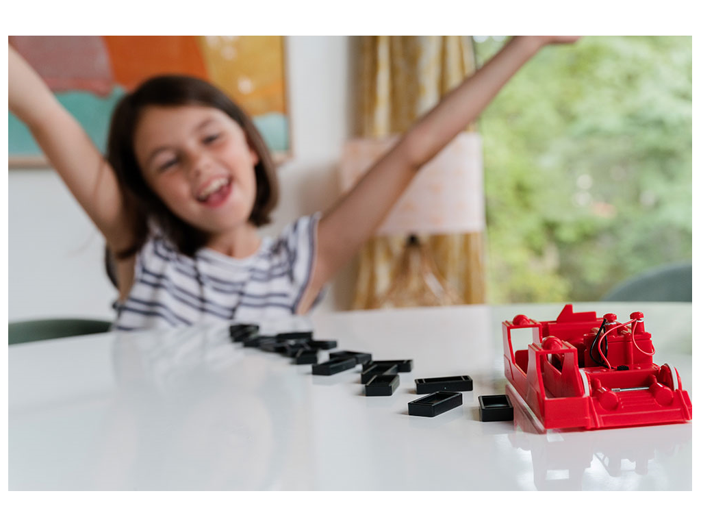 Robot Dominobot – Sestavite robotsko vozilo za postavljanje domin in nikoli več vam jih ne bo treba postavljati ročno! Dominobot domine vselej brezhibno postavi. Zanimivo ga je opazovati in se igrati z njim.