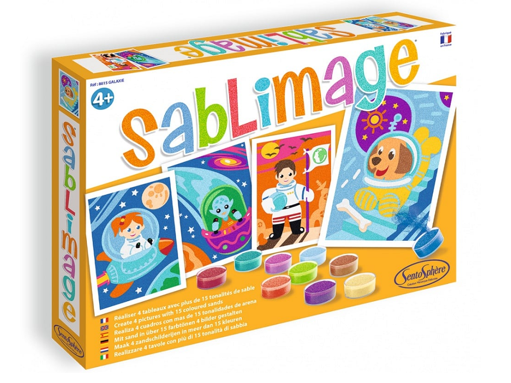 Sablimage na temo galaksije. Odkrijte zabavno dejavnost za razvijanje otroške ustvarjalnosti. Ta komplet vsebuje 15 majhnih lončkov s peskom, 4 plošče, nožek in navodila. Komplet vsebuje za 2 do 3 ure dejavnosti. Z nožkom Sablimage je treba le odlepiti predhodno zlepljene površine in jih posipati z različnimi barvami peska, ki so na voljo.